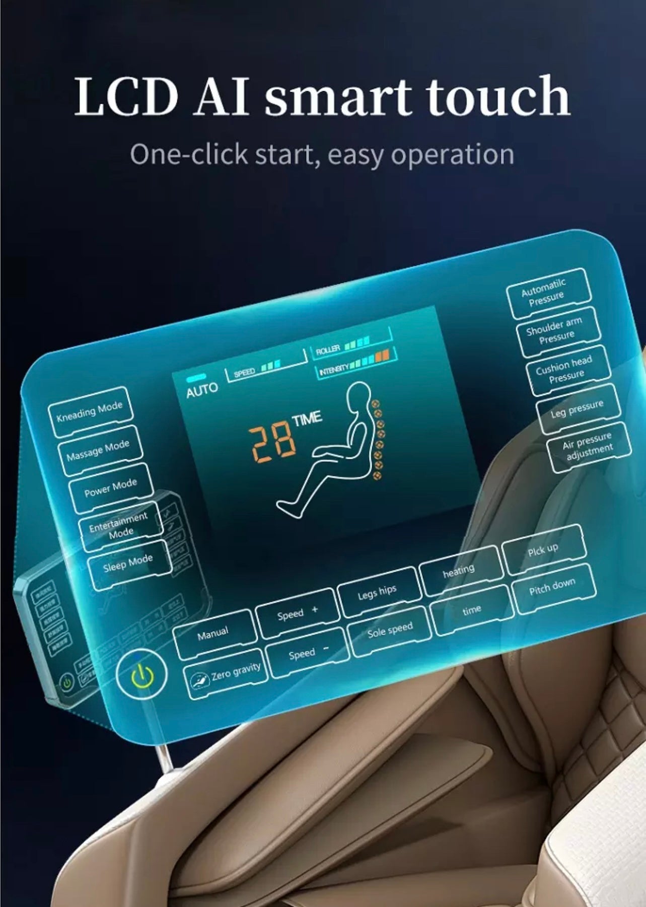كرسي تدليك، جلد مقاوم للخدش، انعدام الجاذبية، بلوتوث، مكبرات الصوت، شاشة LCD تعمل باللمس، وسائد هوائية، تدليك لكامل الجسم
