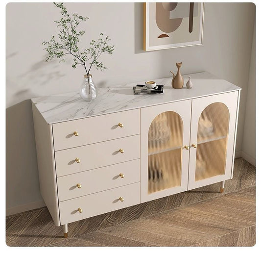 Buffet Sideboard Storage Cabinet Coffee Bar Stone Countertop, 2 Tempered Glass Doors and 3 Drawers.