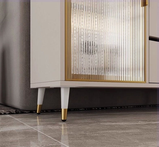 Minimalist Sideboard Buffet Cabinet with Transparent Glass Doors and Gold Accents.