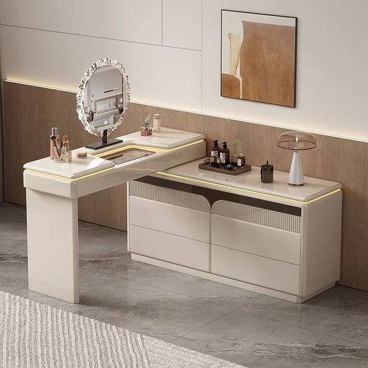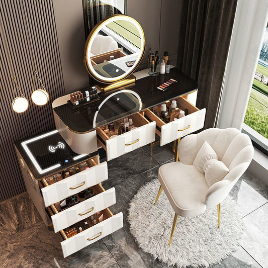 Distinctive Modern Dressing Table of Advanced Solid Wood for Bedroom, with Smart Mirror Makeup Stools Set, Multiple Storage Drawers and Chair.