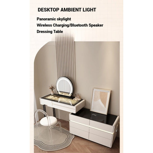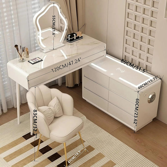 Smart Vanity Table, Dressing Table with Mirror, Chair and Double Chest Drawers Feature a Wireless Charging Speaker LED Light.