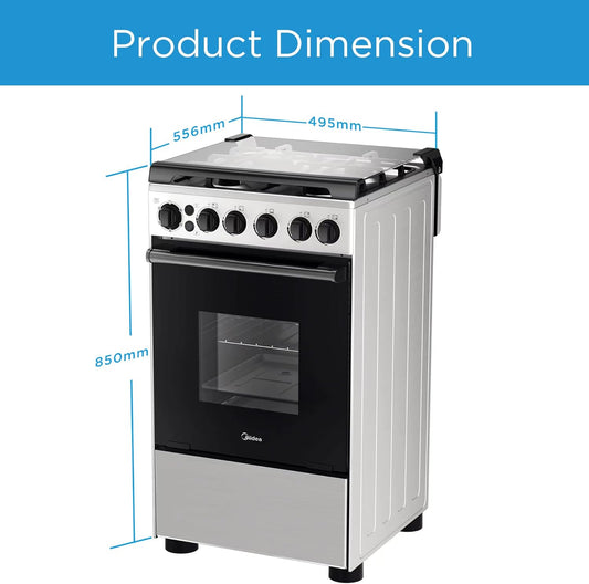 • Midea 50x55Cm Freestanding Cooker, Full Gas Cooking Range With 4 Burners, Stainless Steel, Automatic Ignition & Full Safety, Cast Iron Pan Support, Mechanical Timer, Heat Resistant Knobs
