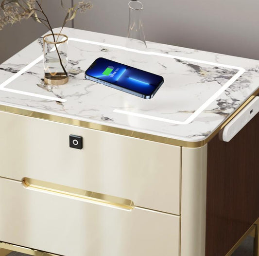 • Bedroom Smart Bedside Cabinet, Wireless Charging, LED Light, Fingerprint Unlock.