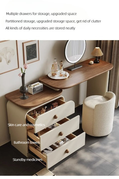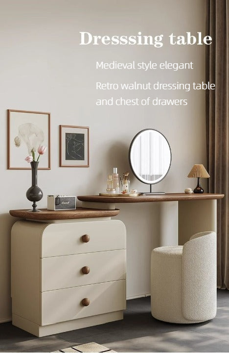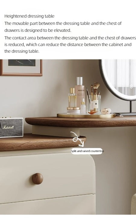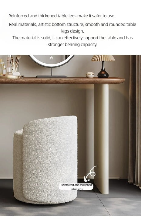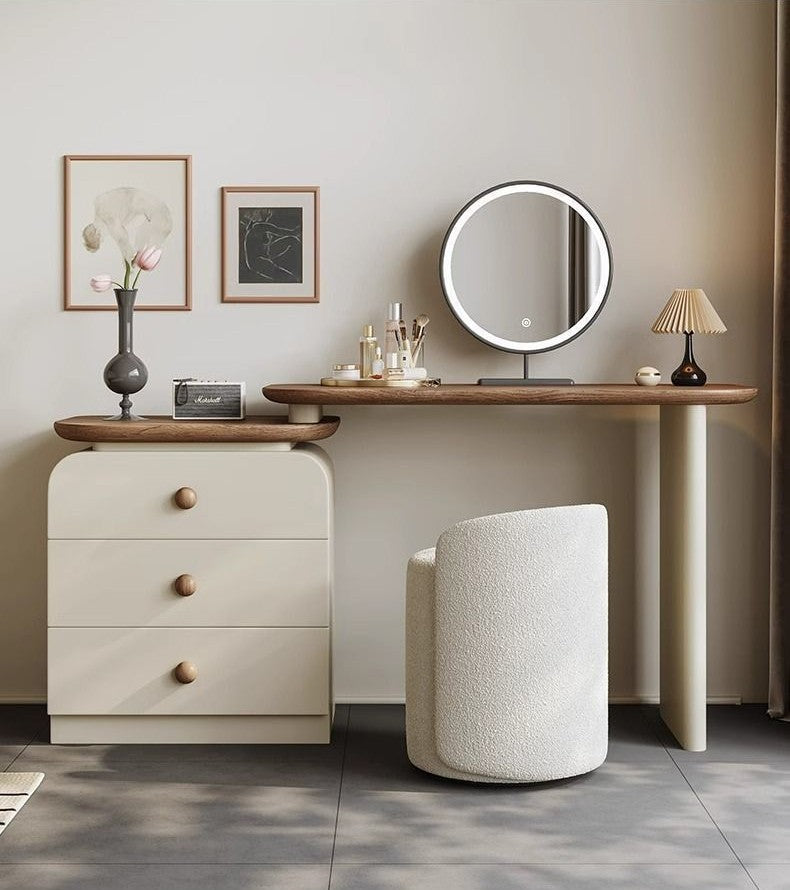 Elevate your daily routine with this sleek modern dressing table set, complete with a round LED mirror, spacious storage drawers, and a stylish stool upholstered in premium leather. The smooth wood accents and minimalist design bring elegance and functionality, making it perfect for bedrooms or walk-in closets. A refined vanity set that combines beauty, comfort, and practicality in one.