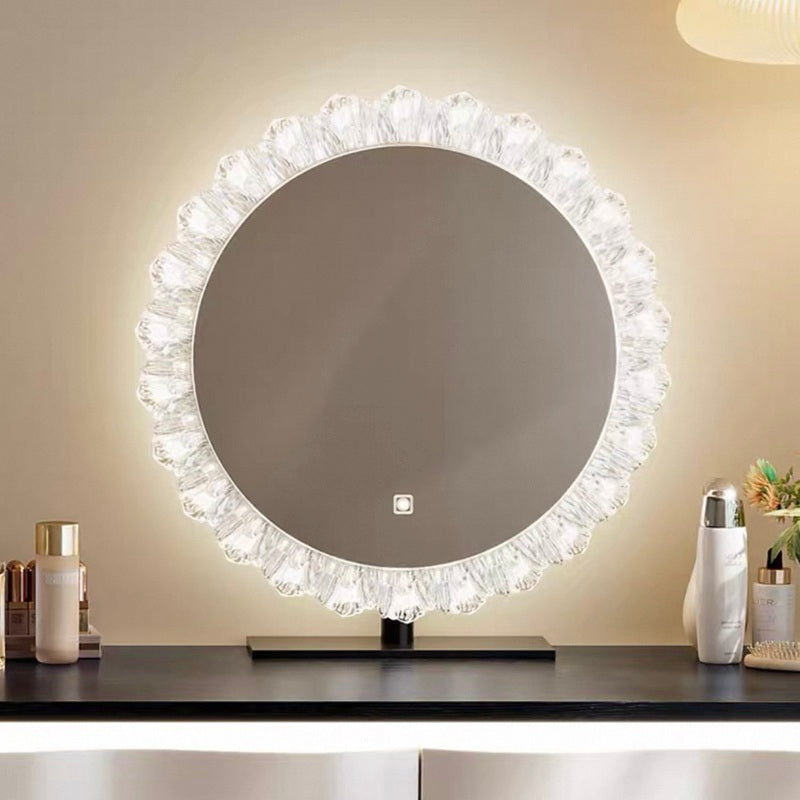 The centerpiece features a large round LED lighted mirror that provides perfect illumination for makeup and grooming, ensuring flawless results every time. Paired with a plush upholstered vanity chair in a soft cream tone, it blends comfort with contemporary elegance.
