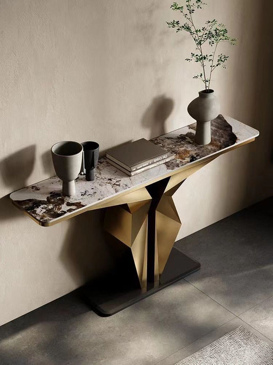 Distinctive Art Entrance Console Table in Sintered Stone Top and Metal Gold Base.