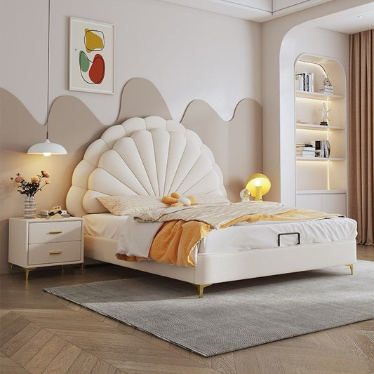 Modern Upholstered Leather Bed, Petal Shaped Headboard with Hydraulic Storage.