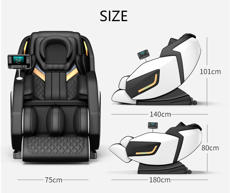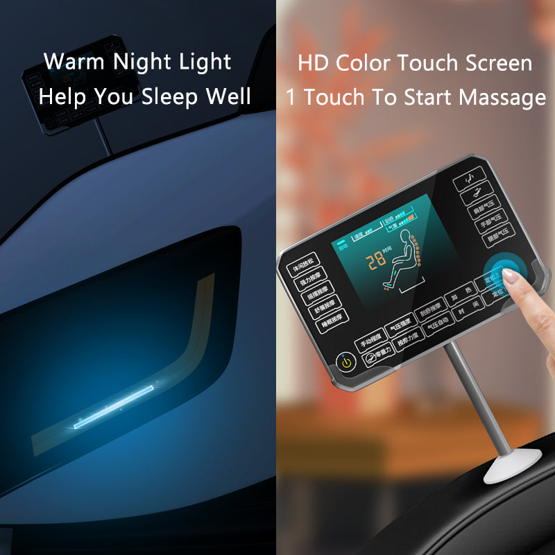 كرسي تدليك، جلد مقاوم للخدش، انعدام الجاذبية، بلوتوث، مكبرات الصوت، شاشة LCD تعمل باللمس، وسائد هوائية، تدليك لكامل الجسم