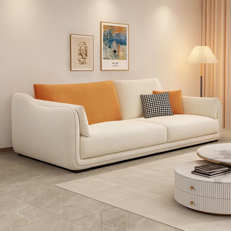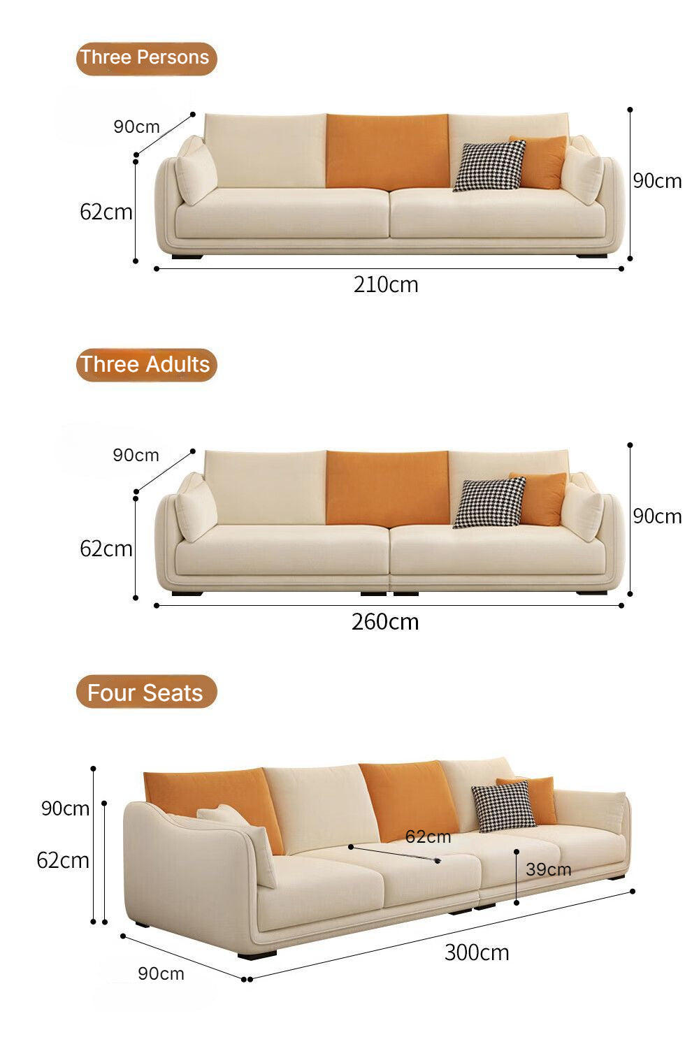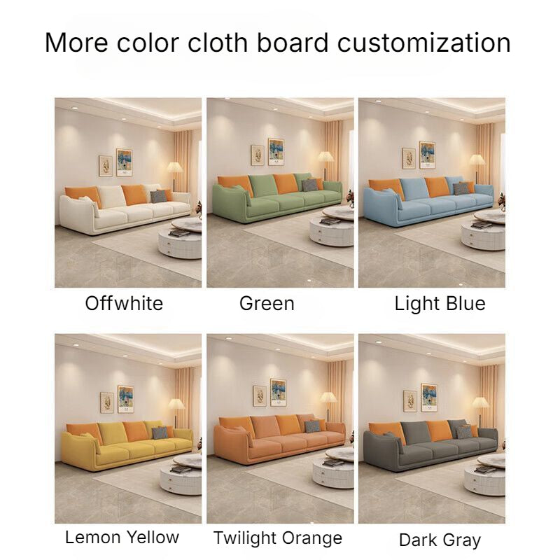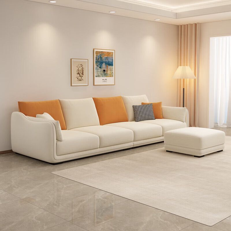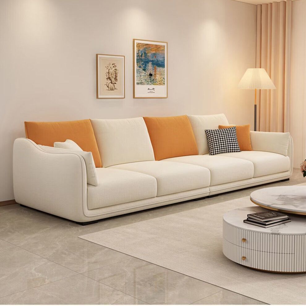 Living room sofa with a modern simple design, featuring a low-profile, spacious seating area with soft, clean lines. Its with accent cushioned backrests in a mix of warm orange and other colors depends on what main color you choose. The plush look suggests it's designed for comfort, with deep seating and a soft.