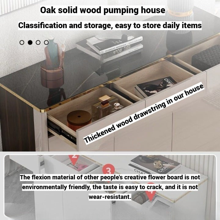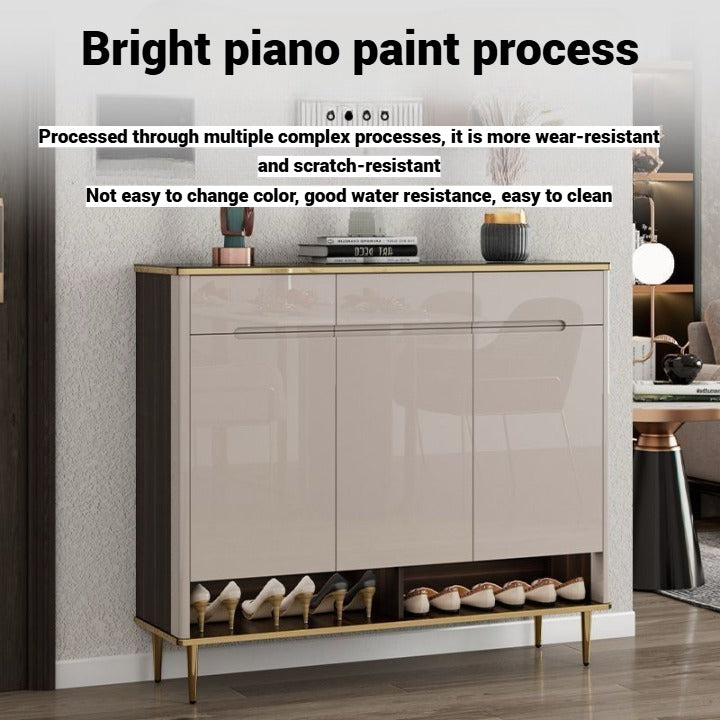 Elevate your home’s entryway with this luxury modern shoe cabinet storage rack, crafted from solid wood and adorned with a sleek tempered glass patterned top for a sophisticated, durable finish. Featuring ample storage space, this shoe organizer combines elegance with function, offering both hidden compartments and open shelving for optimal organization.