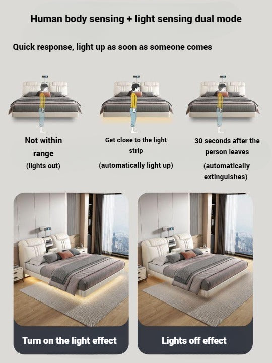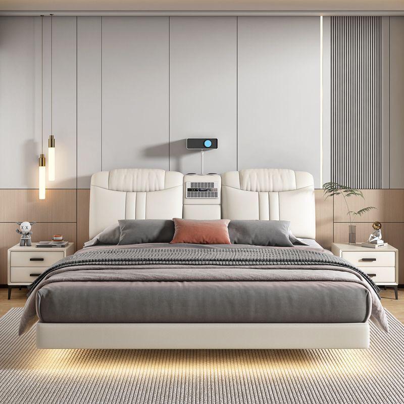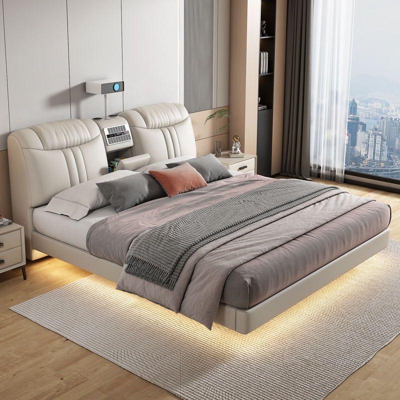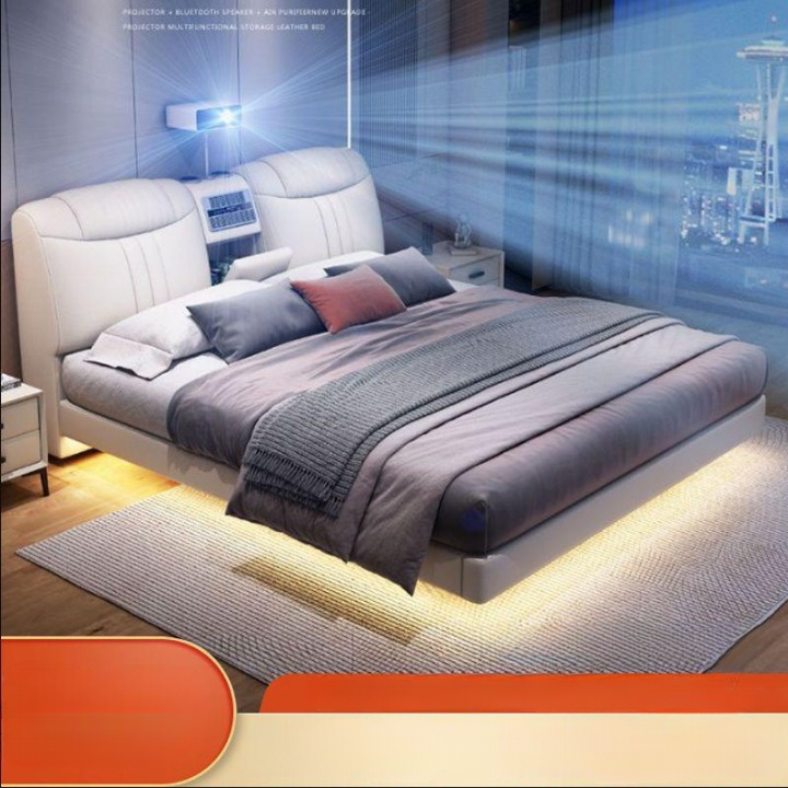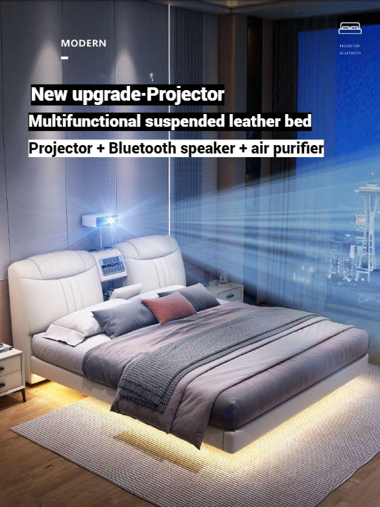 Luxury Smart Bed featuring a floating design with many advanced specifications like projector, USB charging ports, LED light, storage spaces, air purifier, Bluetooth speakers. This modern upholstery leather bed—perfect for smart homes & ultimate relaxation in your bedroom.