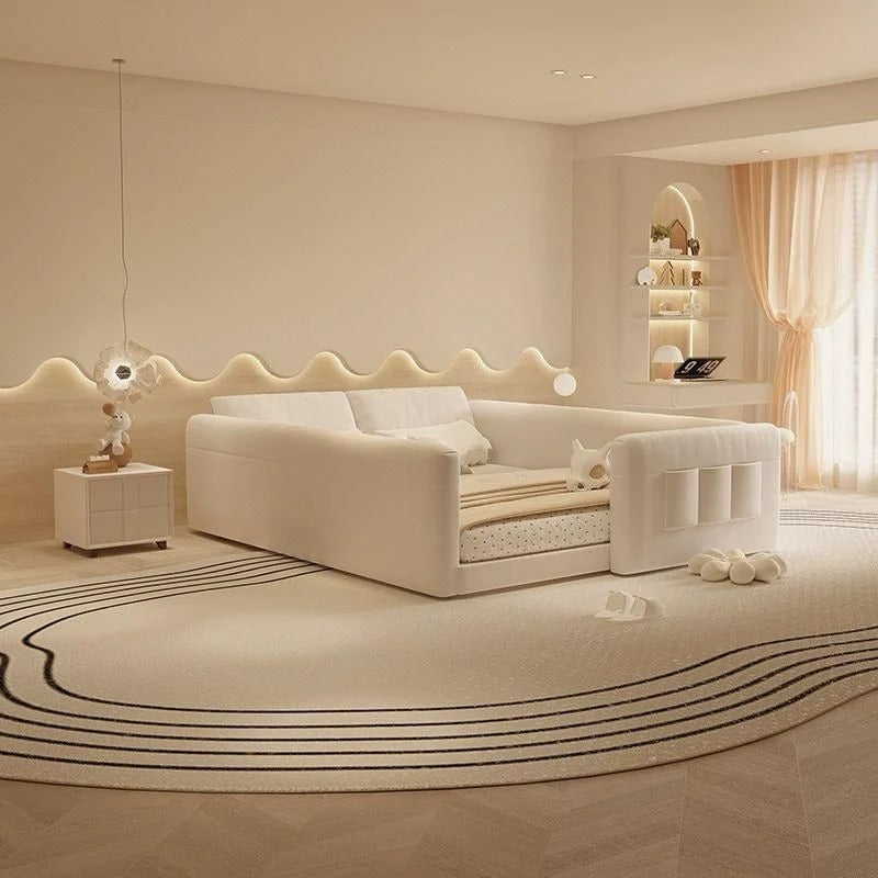 This upholstered bed frame features fully enclosed sides and a protective headboard, creating a secure and cozy sleeping environment ideal for families with children. Designed to prevent accidental falls, it offers peace of mind while enhancing bedroom comfort. Available in single, queen, king, and super king sizes, it accommodates various space and sleeping needs with expert craftsmanship and durable fabric upholstery.