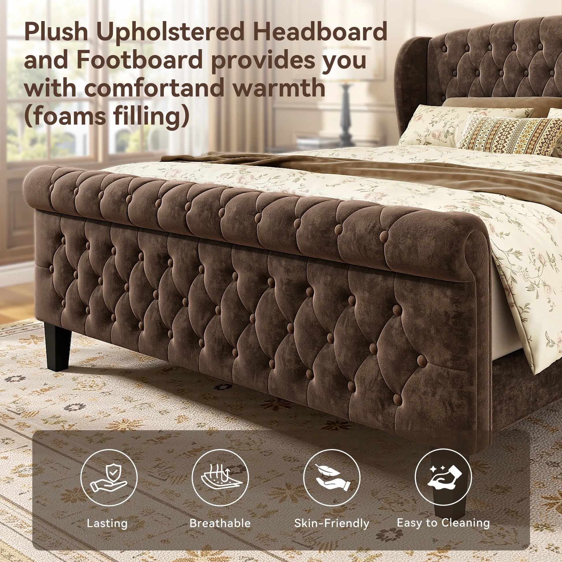 Grand Palace Upholstered Sleigh Bed Frame with Scrolled Headboard and Footboard.